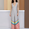 The Eena Jumpsuit is a unique, geometric printed jumpsuit, made from viscose fabric. The deep V neckline features a tie at the back to create the perfect shape on all bodies. This piece is ideal for summer parties with its sleeveless cut, and wide leg design.