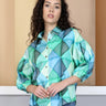 We designed this shirt with a conversational geometric print, which means it's a great go-to when you want to turn up the dial on social interaction. You'll look amazing while also feeling comfortable in this feminine button up shirt. For added style, we made it with three quarter sleeves and dropped shoulders.