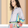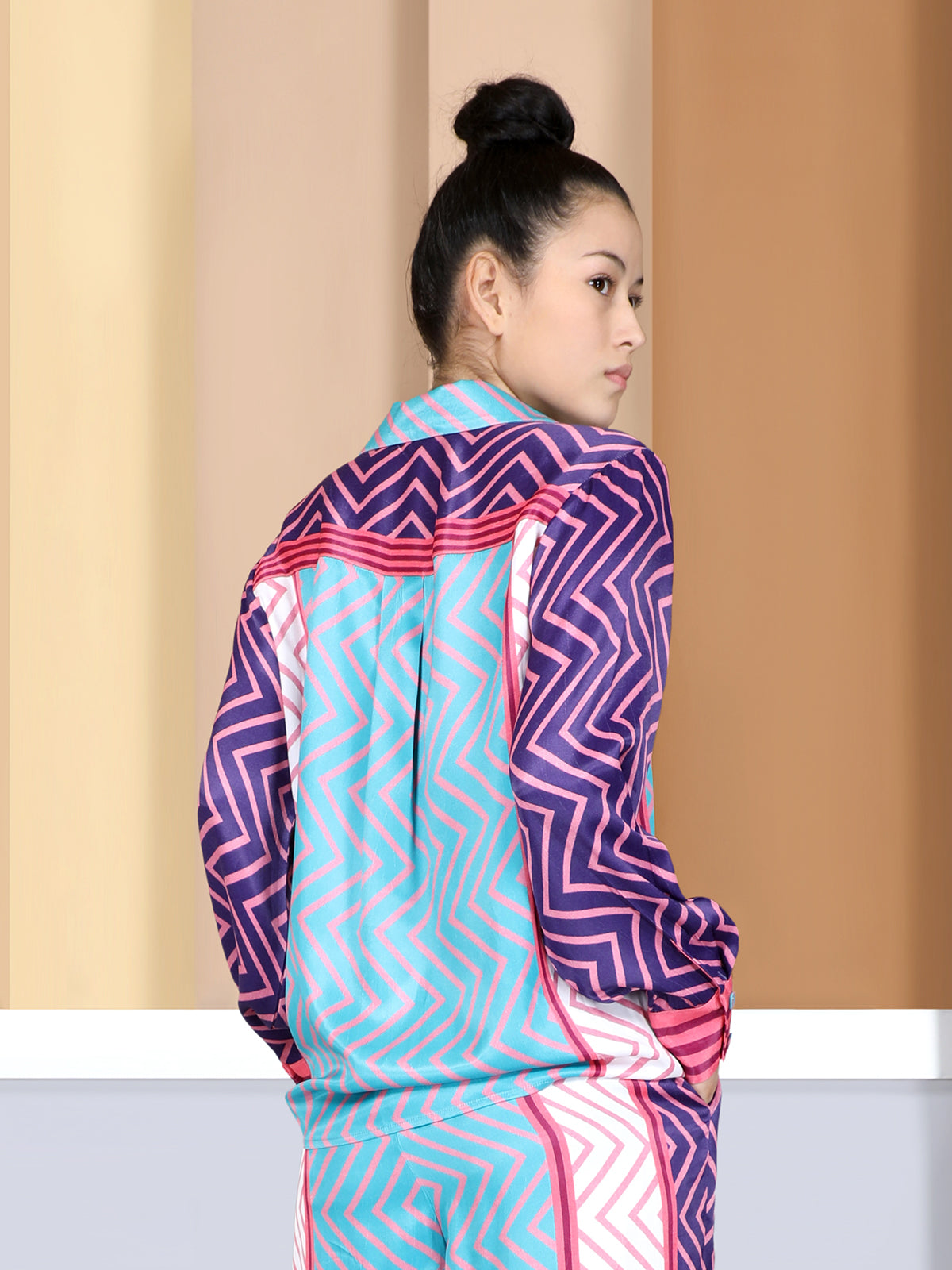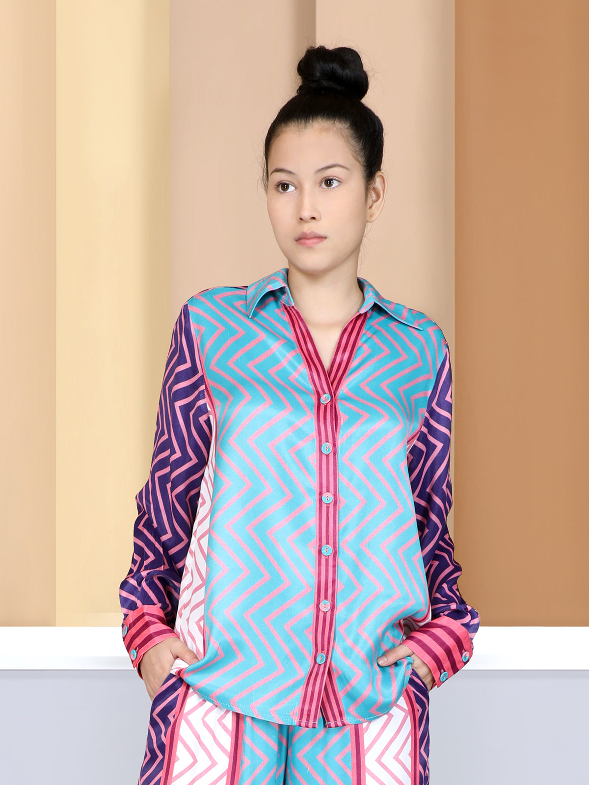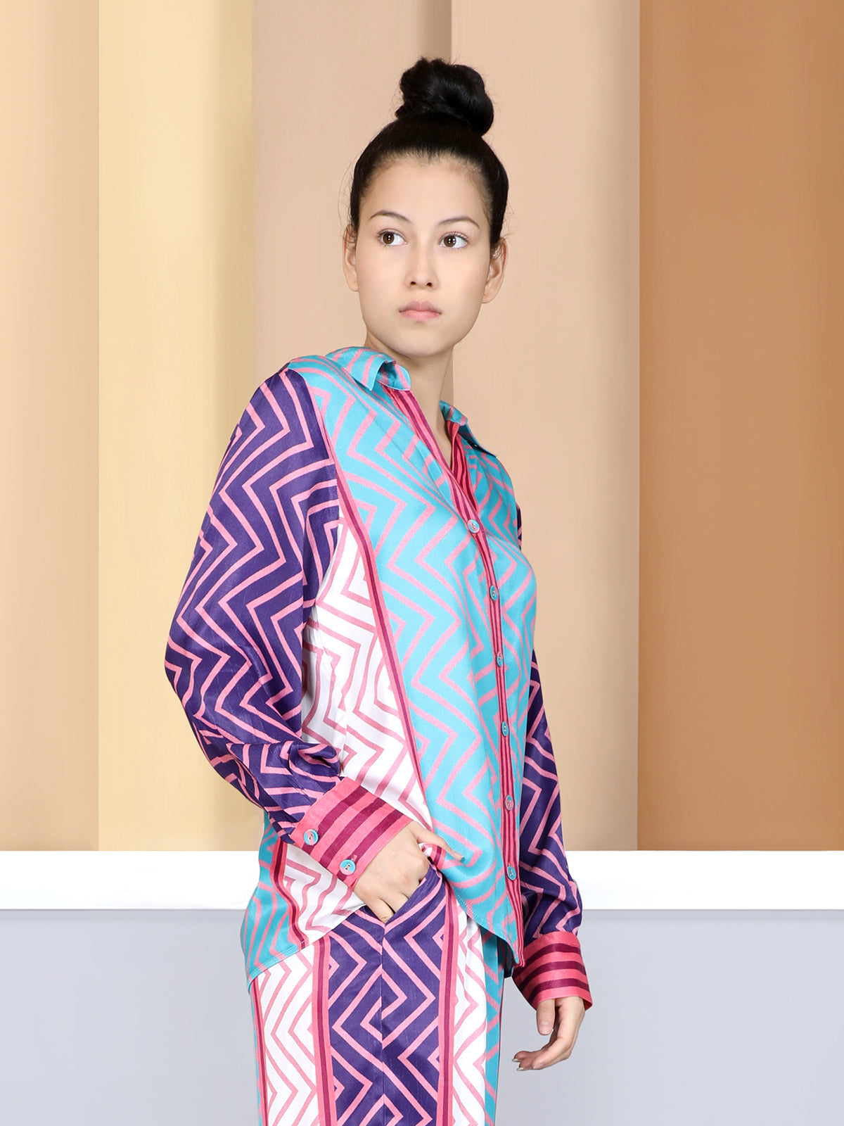 This geometric printed shirt is a must for any wardrobe. Chic yet preppy this piece feels perfect thanks to the super soft crepe satin fabric. An easy and relaxed silhouette to mix and match with jeans, shorts, trainers, heels or even sandals.