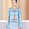 This shirt is ideal for day to night styling. The geometric pattern adds interest, while the bell cuffs and key hole at front and back make it a standout piece. Don’t forget the fabric covered button closure for extra detail. Cut from crepe satin fabric, it’s soft to touch and comfortable against your skin.